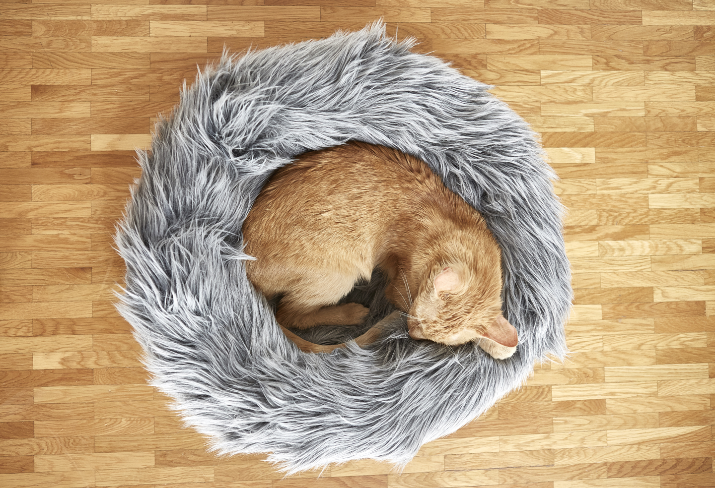 부드러운 모피 침대에서 몸을 웅크리게 되면 고양이에게 가장 아늑한 공간을 만들어줍니다.