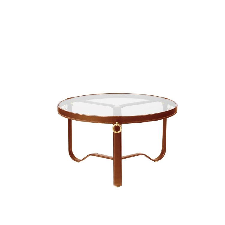 부드럽게 곡선진 금속 다리 세 개 위에 얹혀진 원형 유리 상판은 수작업으로 제작된 가죽 테두리로 감싸여 있으며, 세 개의 금도금 황동 링으로 장식되어 있습니다.